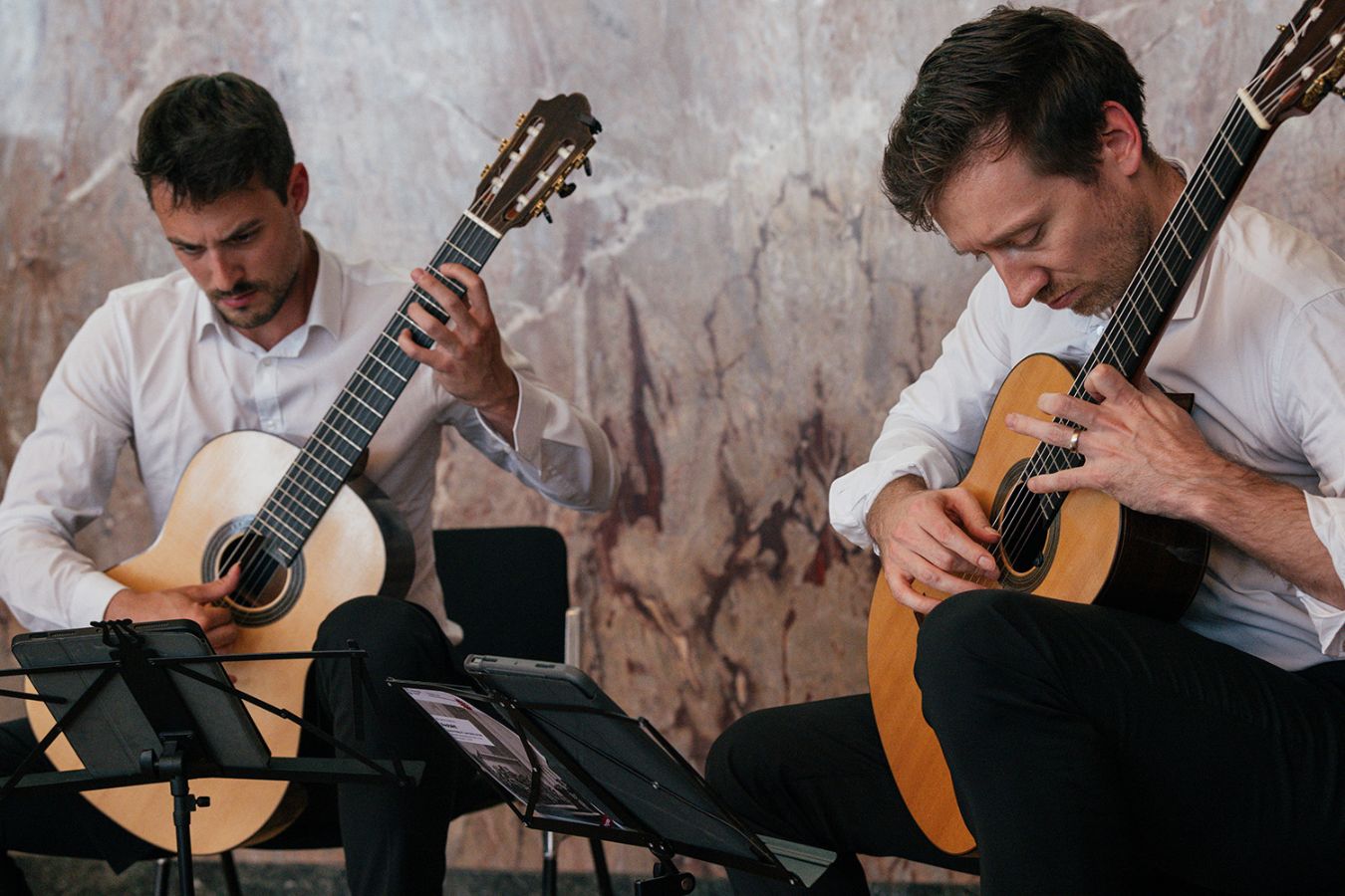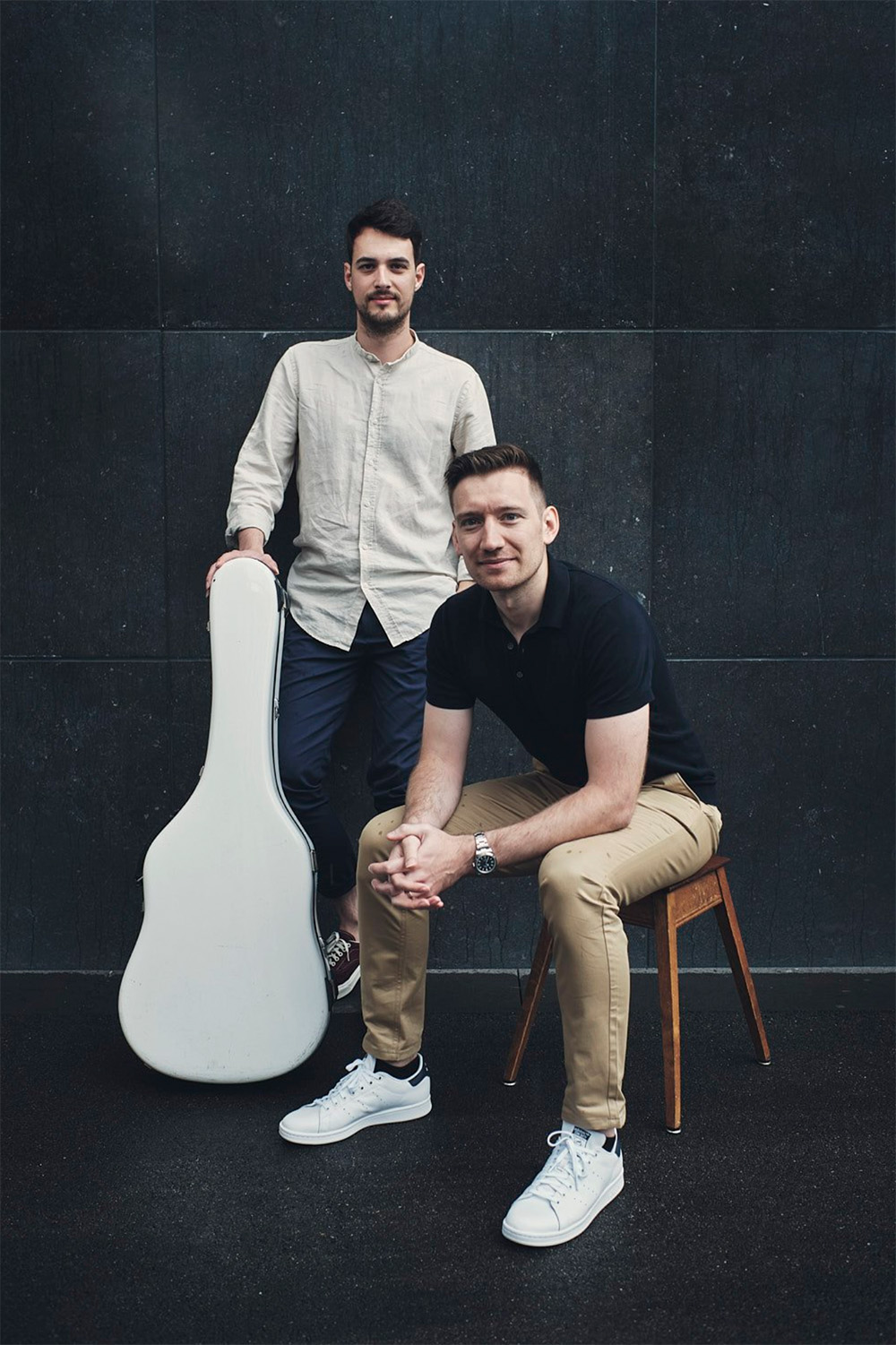 Der Abend wird musikalisch begleitet vom Duo Aratik, bestehend aus den beiden Gitarristen Jure Cerkovnik und Aliaž Cvirn
